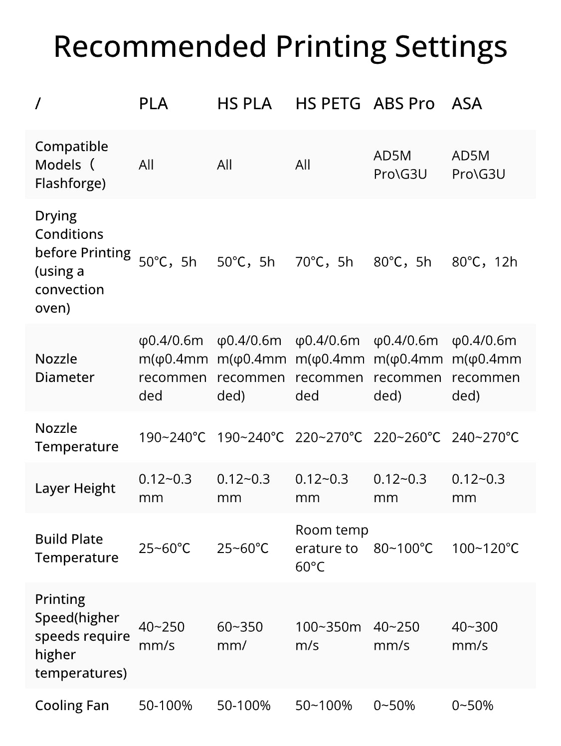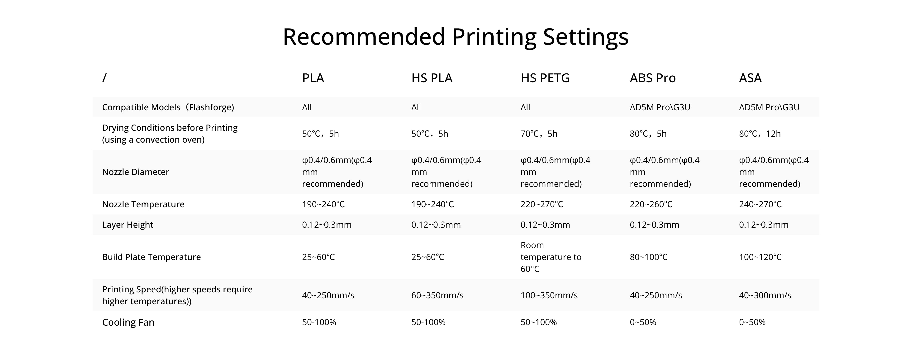 All filaments include: PLA Basic, PLA Pro, HS PLA, PLA-CF, PLA Matte, PLA Silk, ABS Pro, ASA, HS PETG, PETG Pro, PETG CF, and ABS Pro.