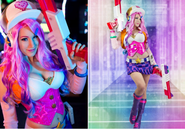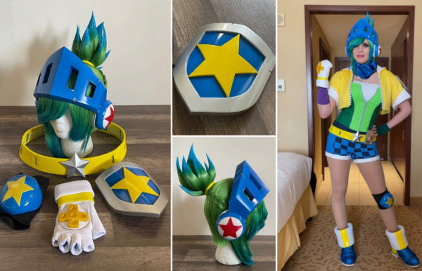 They modeled and printed her headset, belt buckle, armour pieces, and glove accessory in ABS and PLA. Then sanded and finished them with auto detail paint.