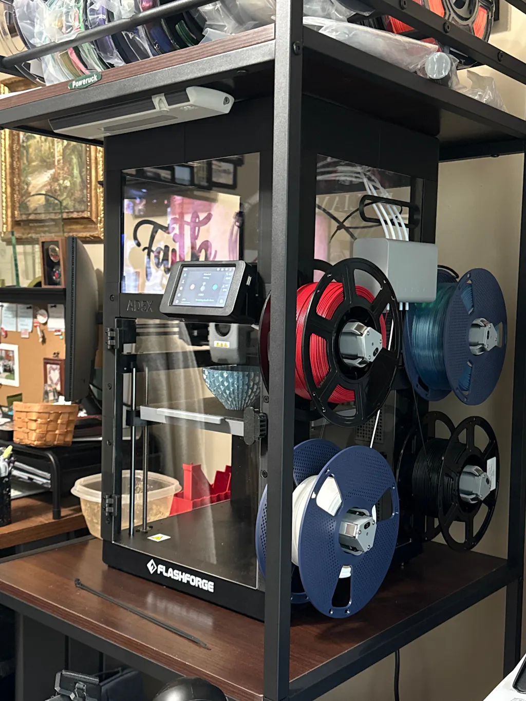 Four spools of filament arranged side by side, effectively reducing storage space and allowing for more flexible placement.